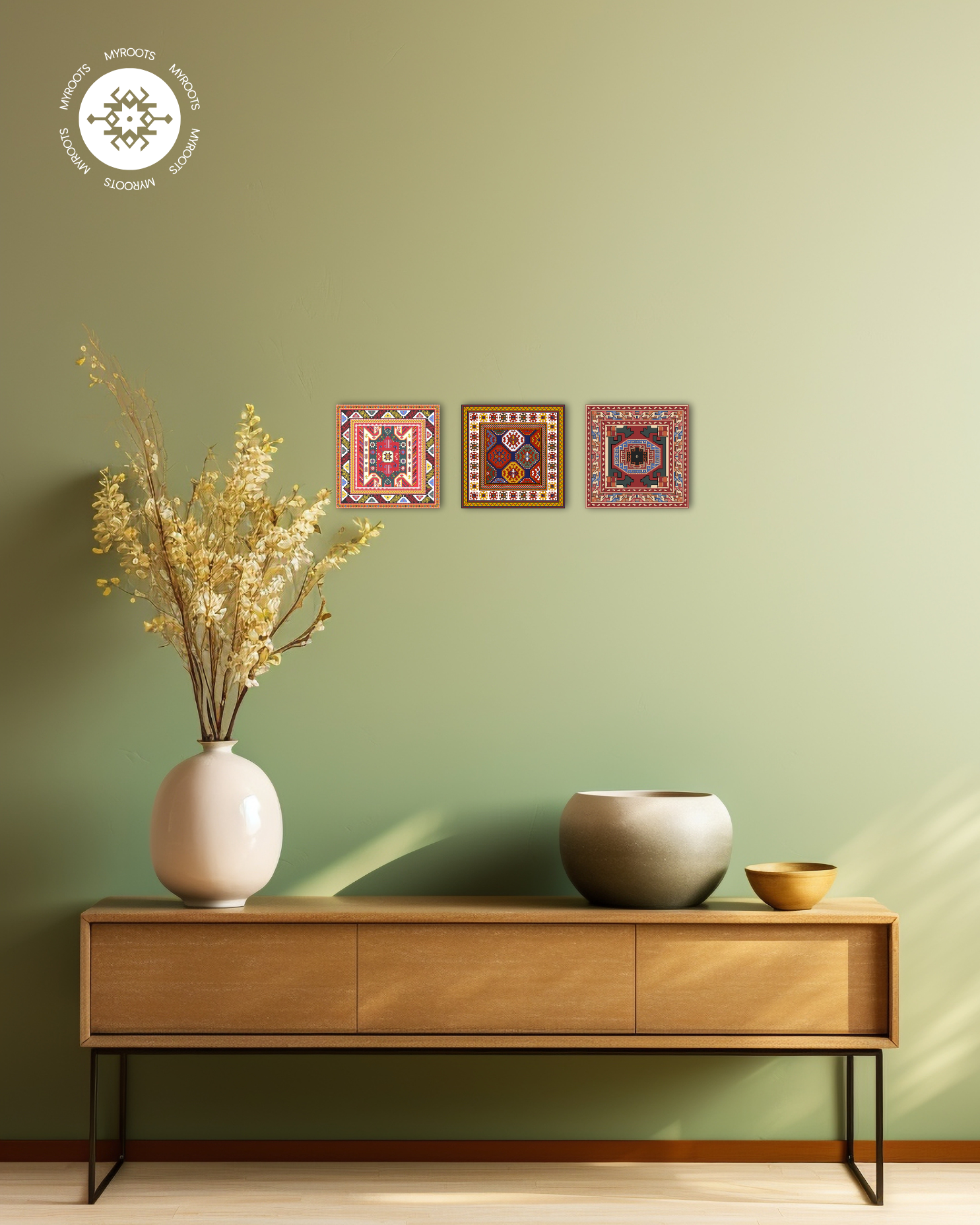 Every tile tells a story. This 3-tile set captures the spirit of traditional carpet weaving, blending symbolic motifs with vibrant artistry. Together, they create a striking presence on your wall, turning everyday spaces into meaningful reflections of heritage and design.