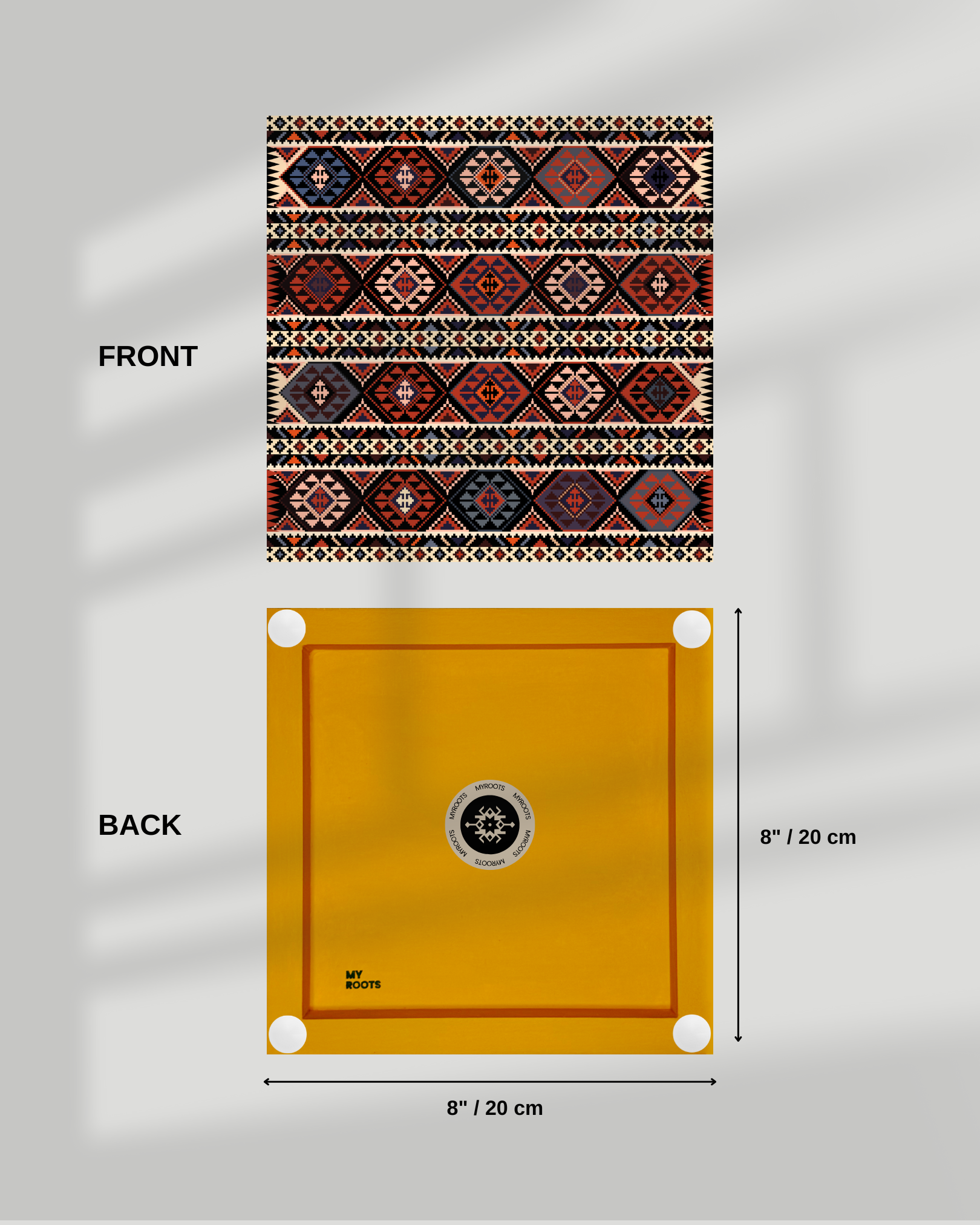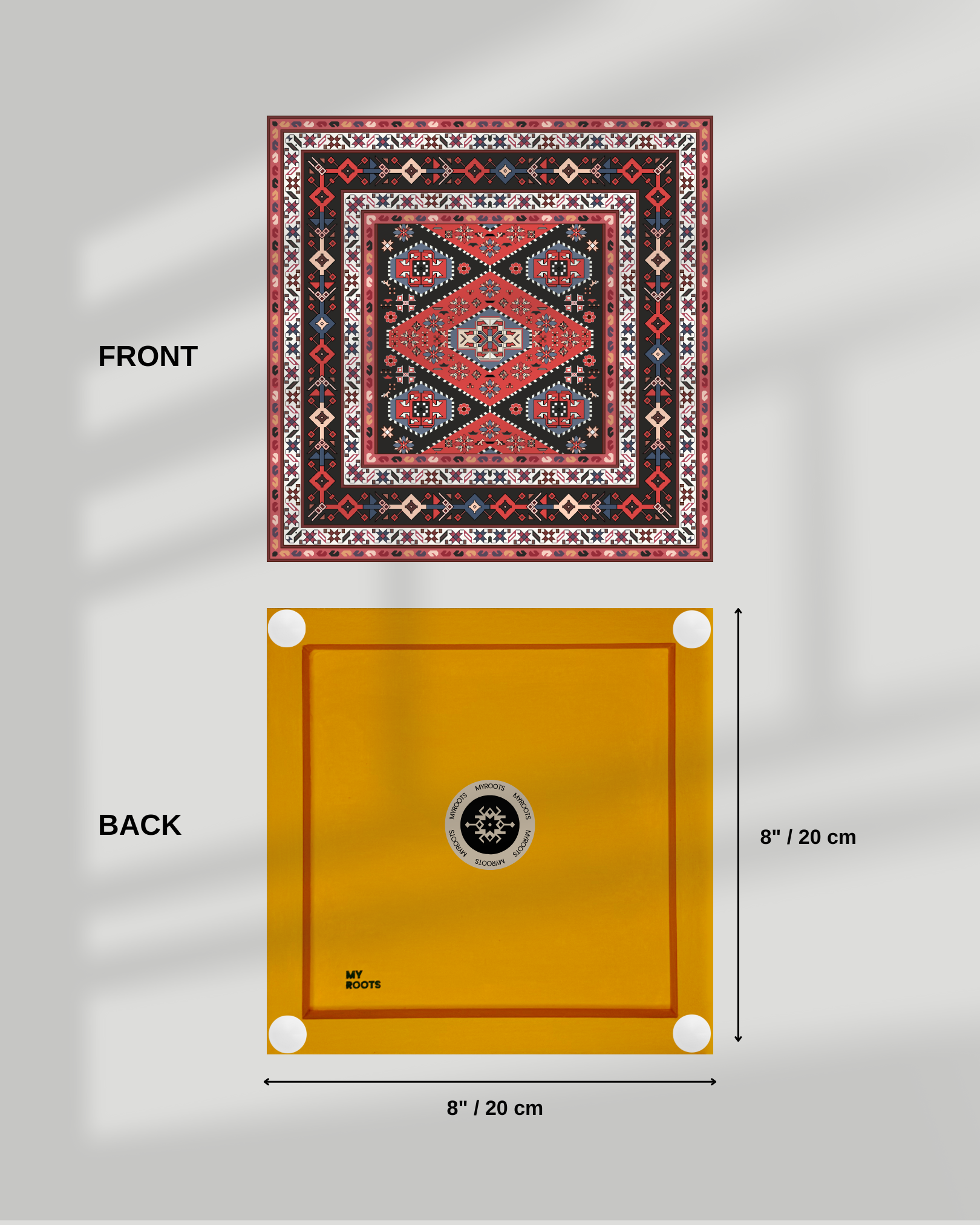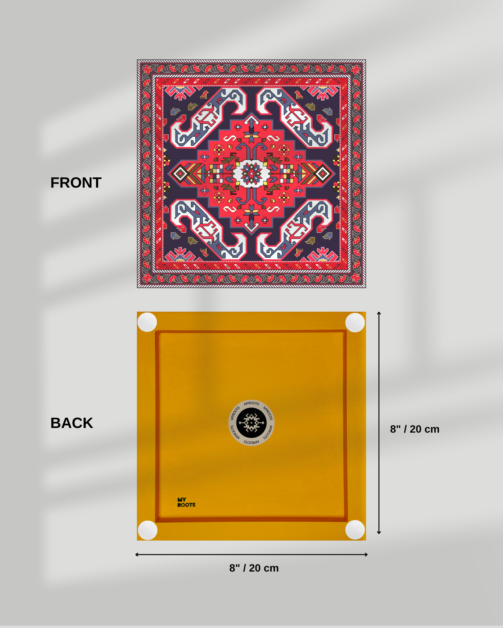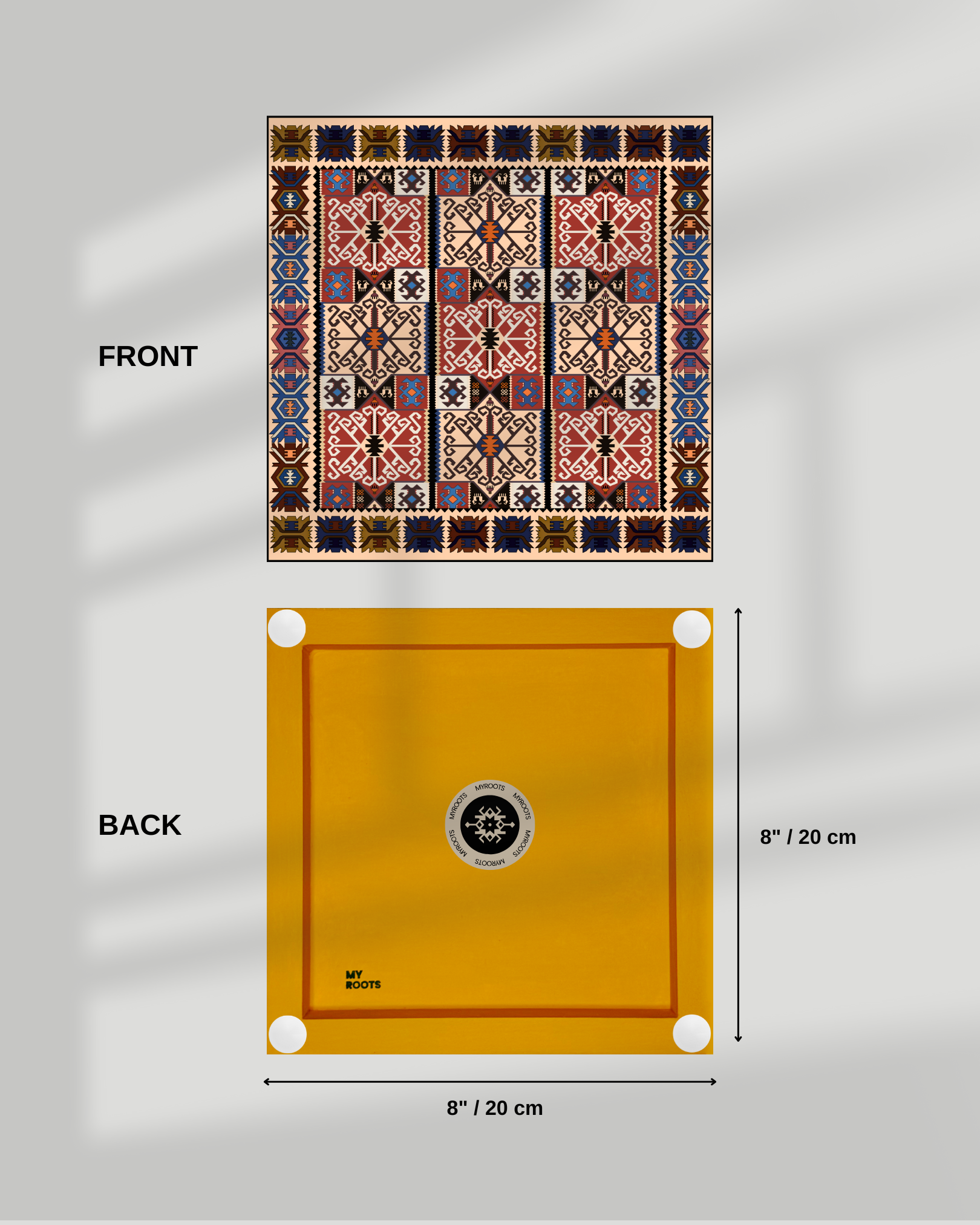 Celebrate the diversity of Azerbaijani carpet heritage with this unique 4-tile set. Each tile highlights a different weaving tradition: the Karabakh with its bold medallions and deep symbolism, the Surakhani from Baku known for its vibrant contrasts, the Baku group reflecting coastal elegance and intricate buta motifs, and the Ganja patterns with their striking geometry and rhythmic flow. Together, they create a powerful story of art, tradition, and cultural memory.