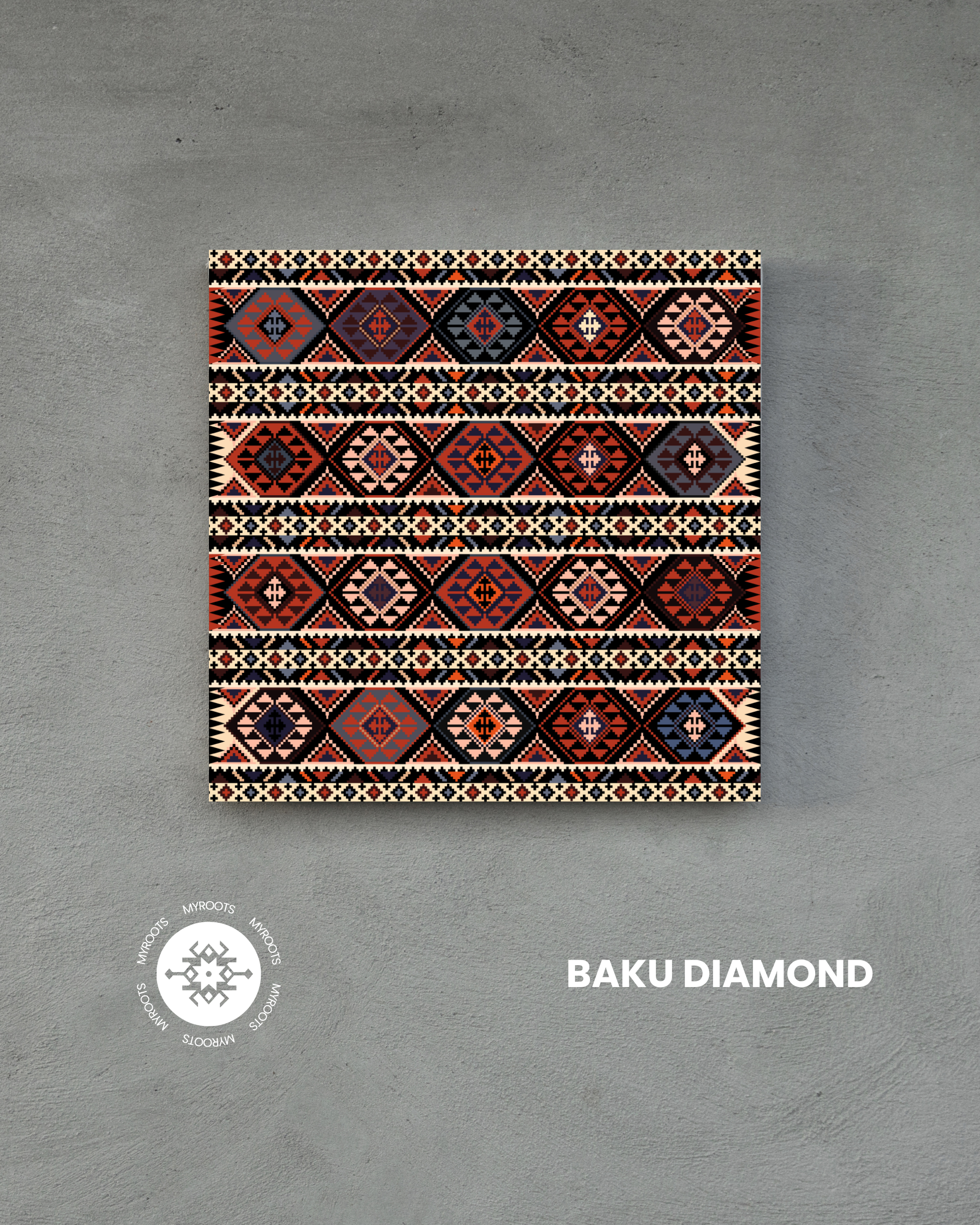 The Baku Diamond Tile draws inspiration from the intricate designs of traditional Azerbaijani rugs, specifically those from the Baku region. Showcasing geometric motifs such as diamonds, triangles, and octagons, this tile embodies the precision and artistry of age-old craftsmanship. Its striped layout, featuring alternating patterns, creates a harmonious rhythm that speaks to the legacy of Azerbaijani weaving traditions.