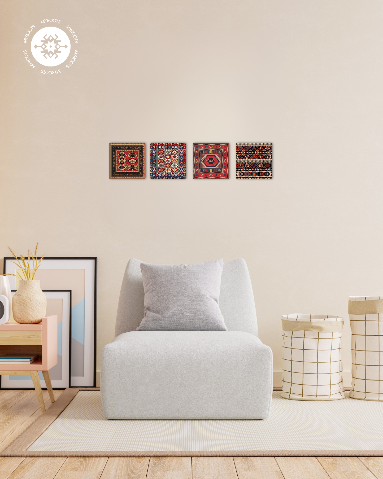 The rich color palette—deep reds, bold blues, and soft ivory—adds depth and warmth, making this tile a versatile addition to any decor. Whether used as a statement piece or part of a larger arrangement, the Baku Diamond Tile brings cultural richness and elegance to your space.