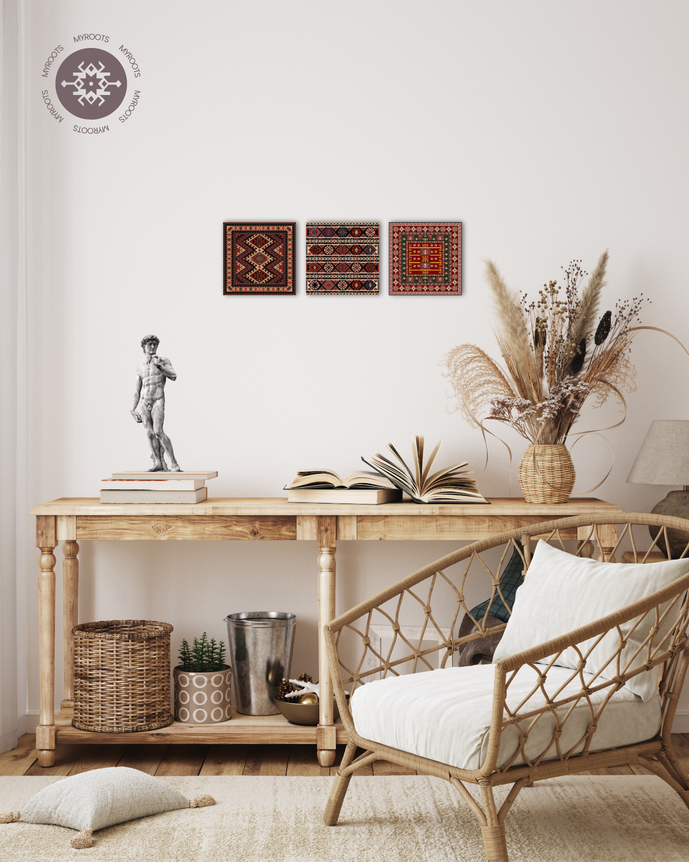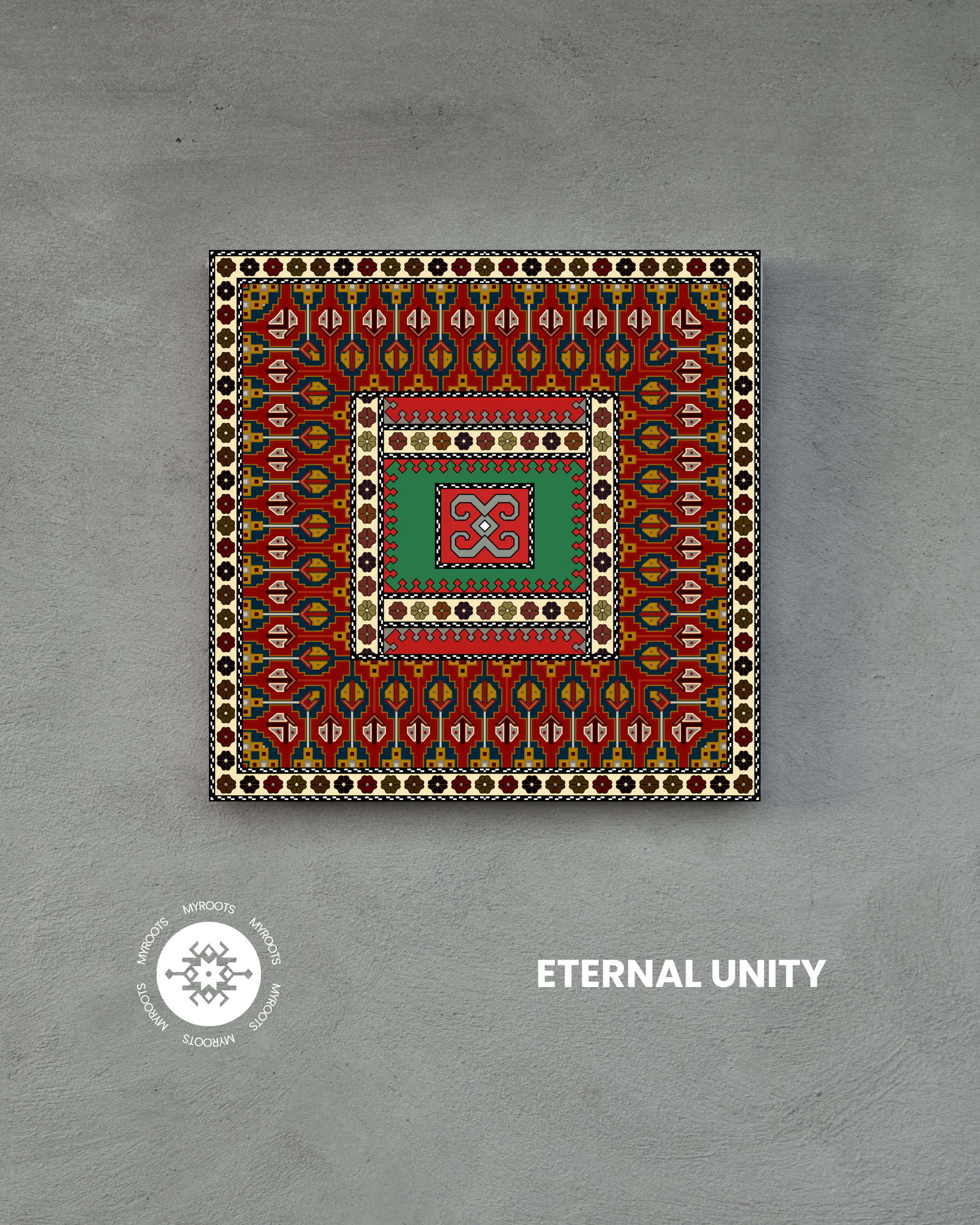 Experience the vibrant heritage of the Gazakh carpet-weaving tradition with the Eternal Unity Tile. This design encapsulates the essence of Gazakh artistry, blending striking geometric patterns and symbolic motifs. The centerpiece features a bold knot motif, symbolizing unity and interconnectedness, surrounded by a harmonious blend of earthy reds, deep greens, and golden hues.