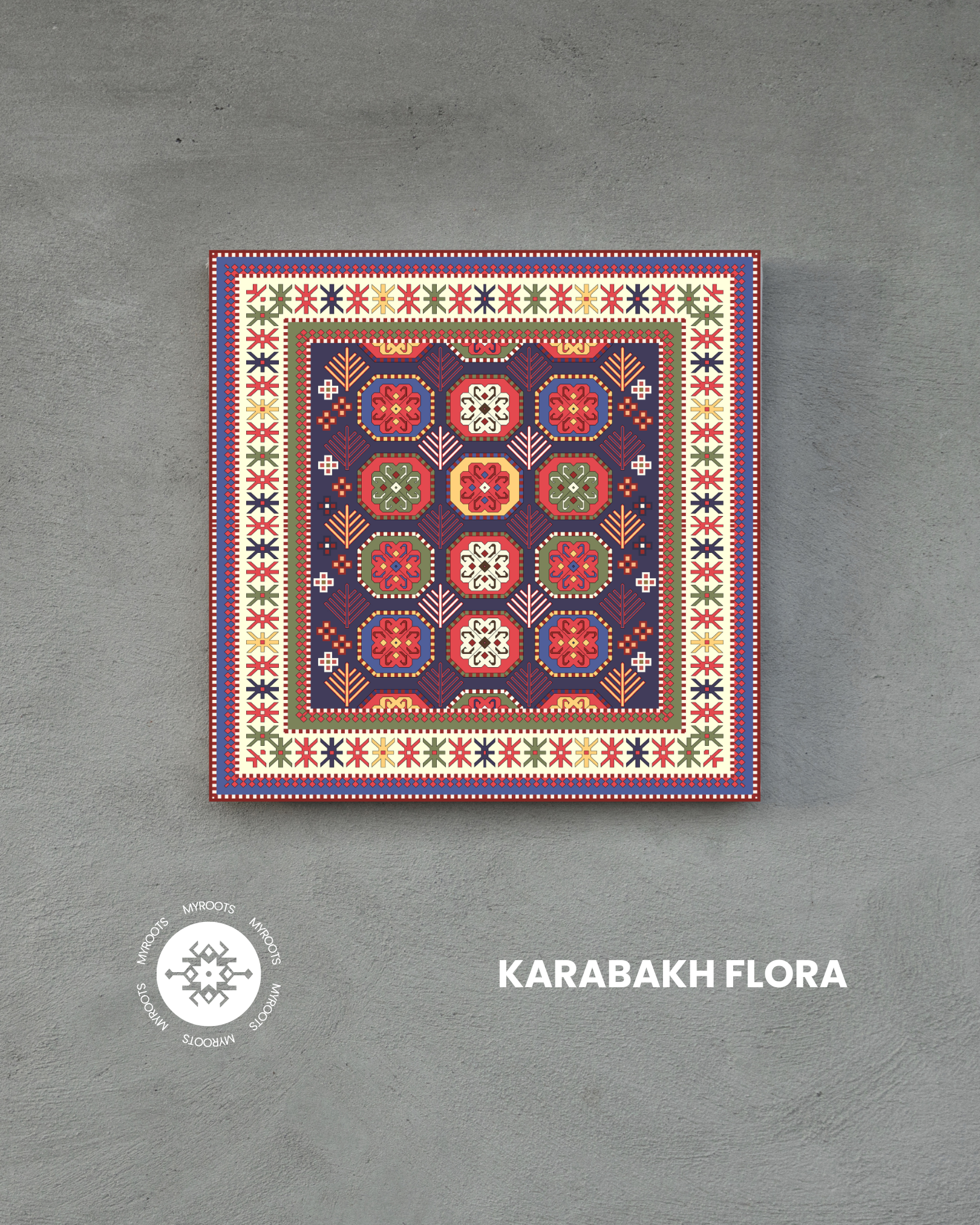 Celebrate the timeless beauty of Karabakh’s weaving traditions with the Karabakh Flora tile. Inspired by the exquisite floral patterns of Karabakh carpets, this design features a vibrant tapestry of blossoms, leaves, and vines in a harmonious blend of light and bright colors—yellow, blue, red, purple, and green. Each flower and leaf tells a story of nature’s abundance, symbolizing growth, renewal, and the enduring connection between art and the natural world.