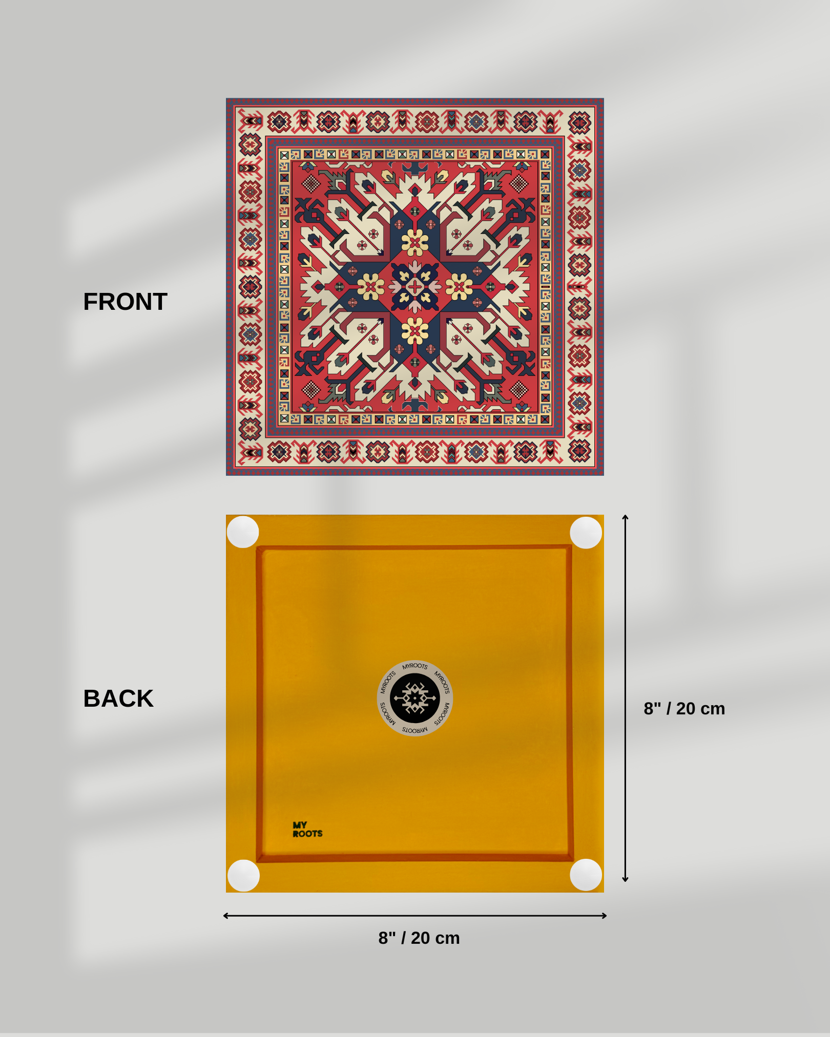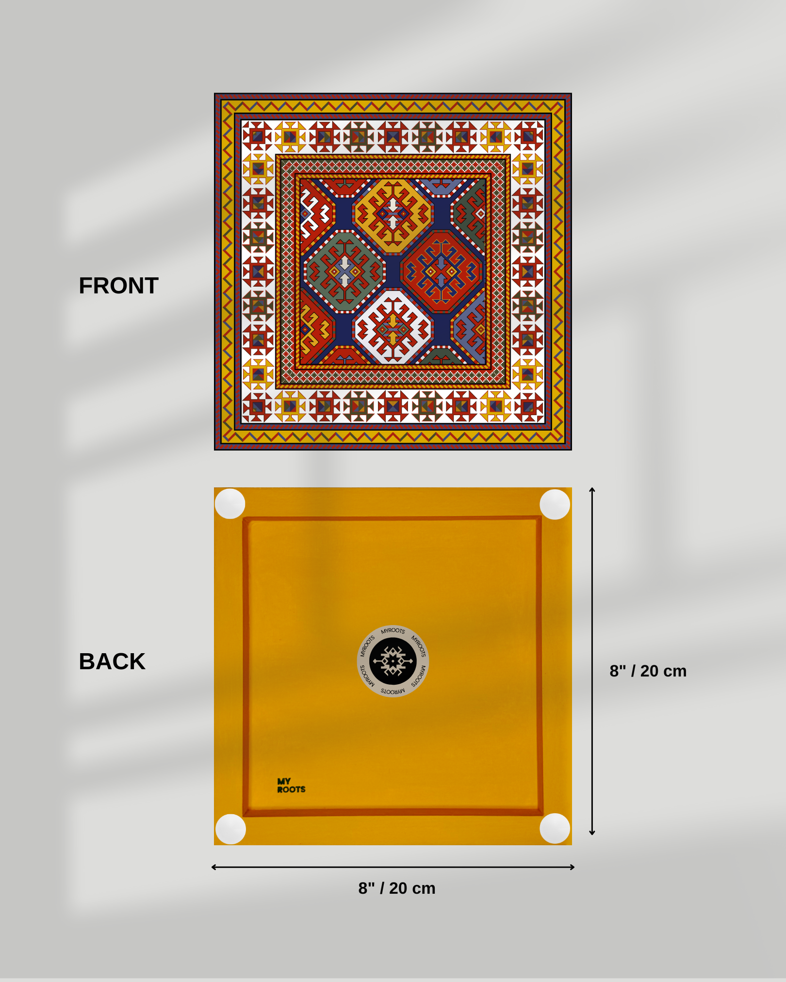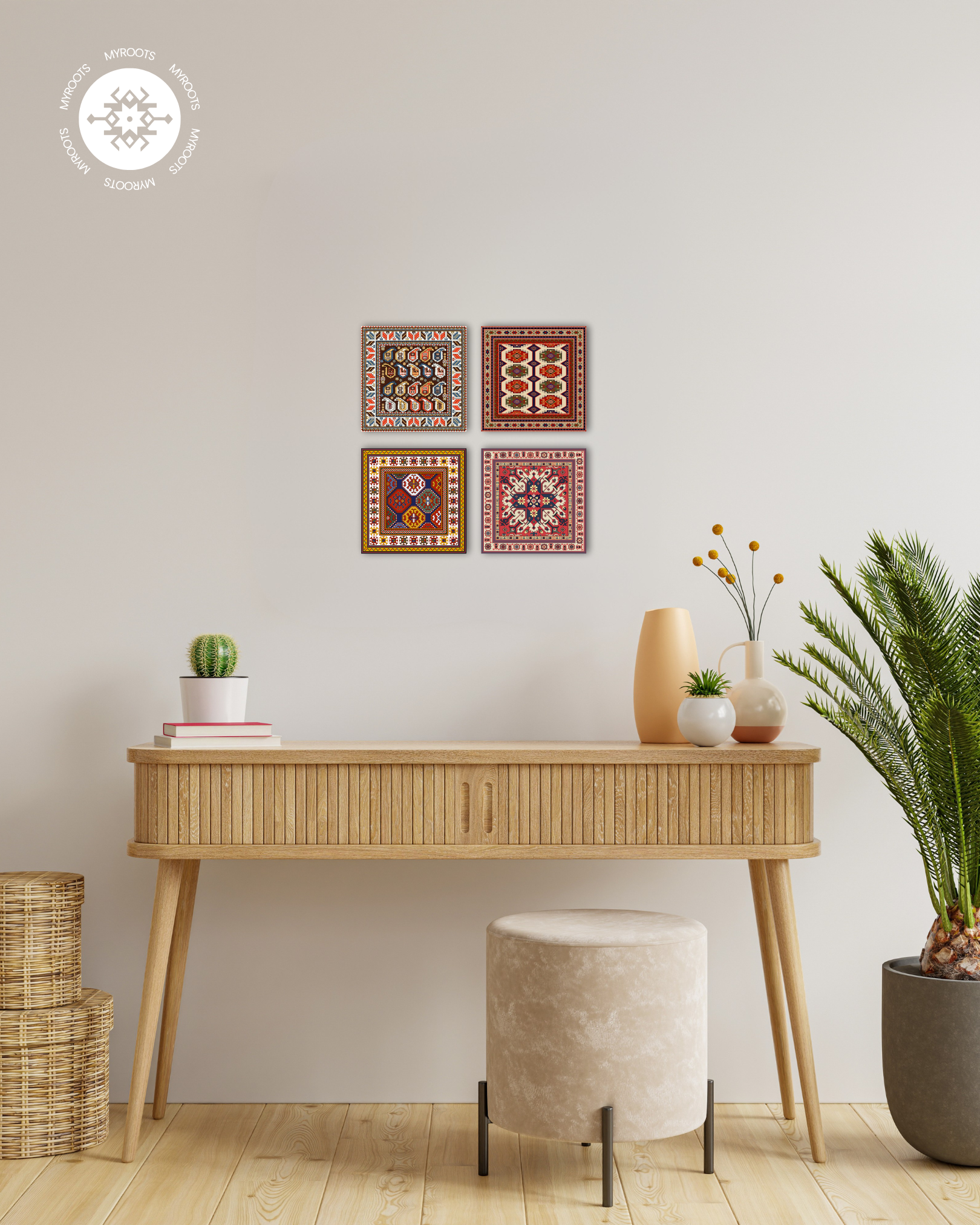 Bring centuries of artistry into your home with this 4-tile set, crafted to celebrate the diversity of Azerbaijani carpet weaving traditions. Each 8"x8" tile is printed on premium wood and canvas, preserving intricate details and vibrant motifs that carry history and meaning.